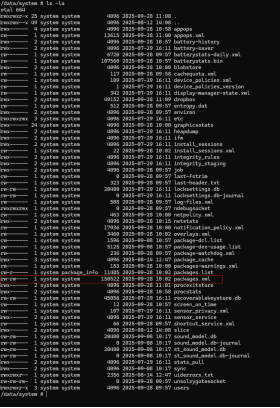 这个文件存放与/data/system/目录下,文件名为“packages.xml”,这个文件记载了当前设备中安装的app的元数据,比如安装时间、更新时间、所需权限、UID、签名哈希与版本好,利用好这个文件内容可以构建一段时间线,证明在某件事发生之前,当前设备是否安装或者更新了数据,部分截图如下所示: