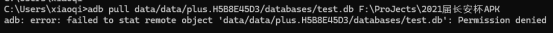 安装成后运行一下app后,使用adb连接模拟器,并获取管理员权限,成功获取到之后进入app的私有目录,由jadx我们得到该app的包名“plus.H5B8E45D3”,根据前面所说那么完成的目录为/data/data/plus.H5B8E45D3/,进入目录查看数据库文件名为:test.db,部分截图如下所示: