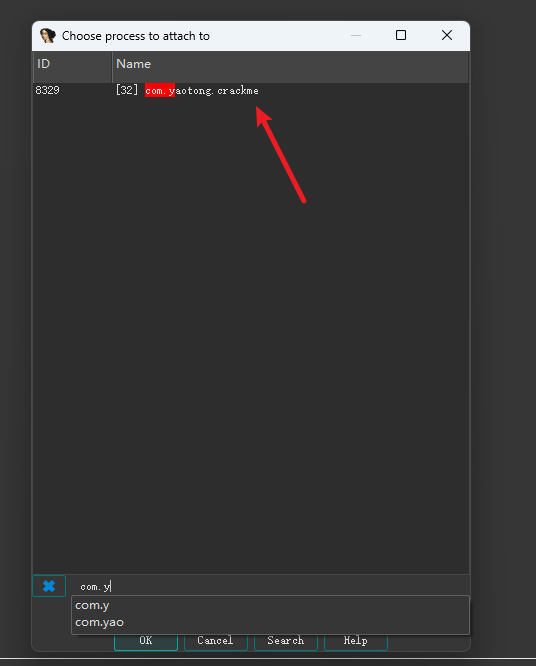 选择进程,在Android中进程名一般用包名,所以直接搜包名即可
