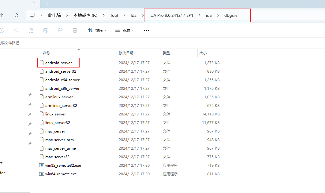 这个armeabi对应的架构为32为的arm,在ida目录下调试服务器文件选择android_server